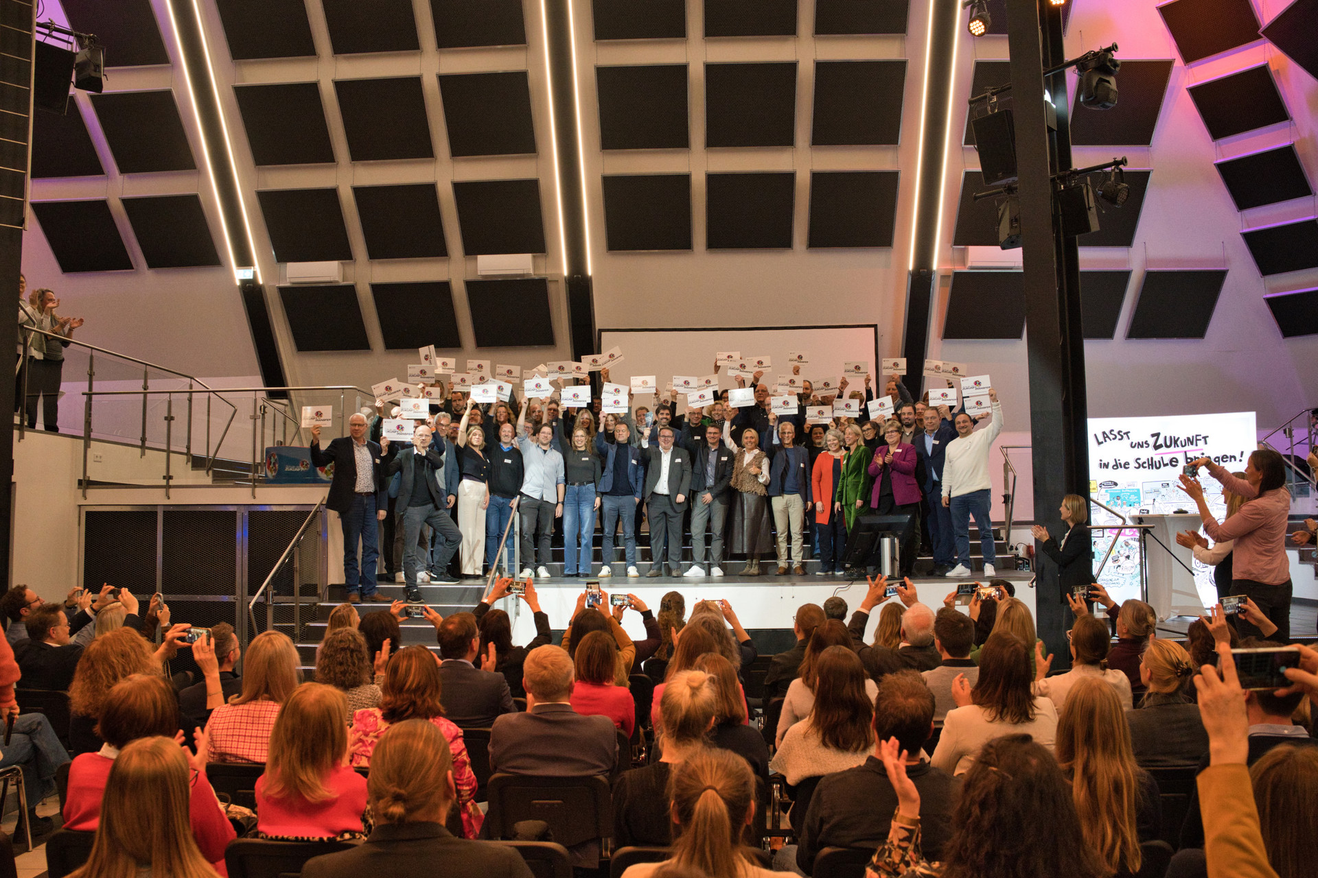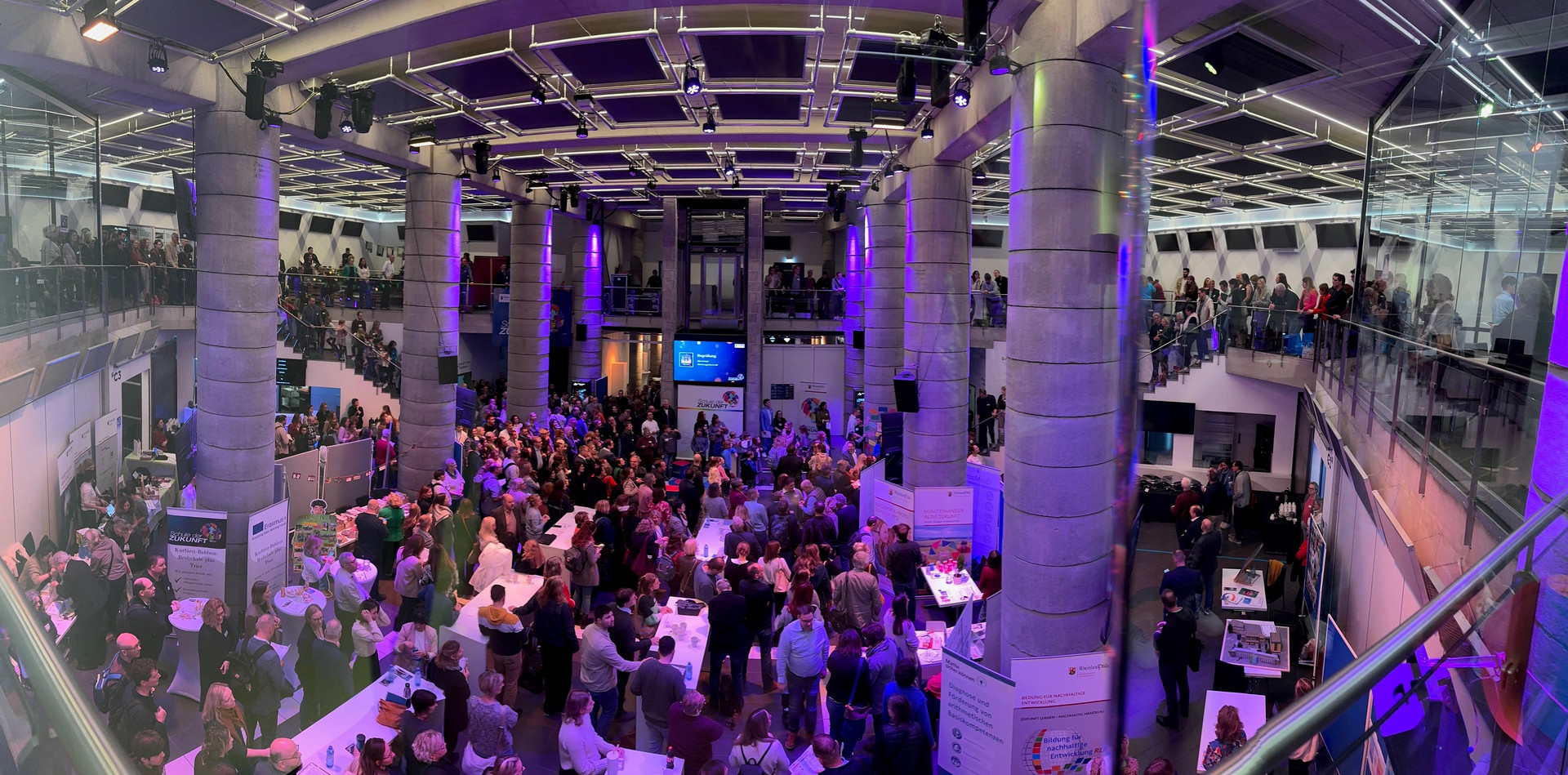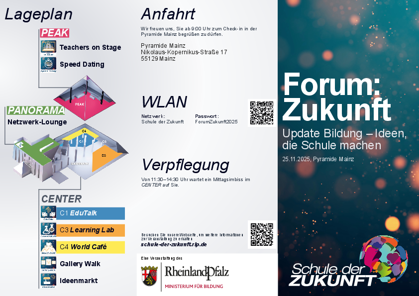 Beim „Forum: Zukunft“ in diesem Jahr im Messeformat: „Update Bildung – Ideen, die Schule machen“ am 25.11.2025 von 10 bis 16 Uhr in der Pyramide Mainz bekamen die Gäste Gelegenheit, an den Erfahrungen und Erkenntnisse, die die Schulen der Zukunft auf ihrem Weg gesammelt und erarbeitet haben, teilzuhaben. Die von Frau Staatssekretärin Bettina Brück eröffnete Veranstaltung bildete den Höhepunkt und Abschluss der ersten Phase der Initiative und bot ein vielfältiges Programm: